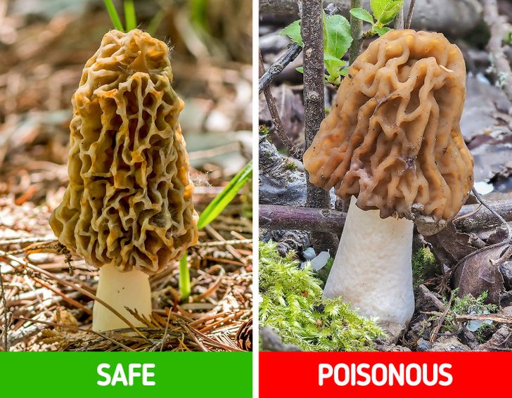 Πώς μπορείτε να τις ξεχωρίσετε: Η μουρχέλα (που απεικονίζονται αριστερά) έχει κοίλα στελέχη και καλά κολλημένες κορυφές με κυψελοειδή εμφάνιση. Το μακαρονάκι (στην εικόνα δεξιά), από την άλλη πλευρά, έχει συμπαγή στελέχη και σπογγώδεις κορυφές που μοιάζουν με εγκεφάλους, που είναι πολύ παρόμοια με αυτά της μουρχέλας.