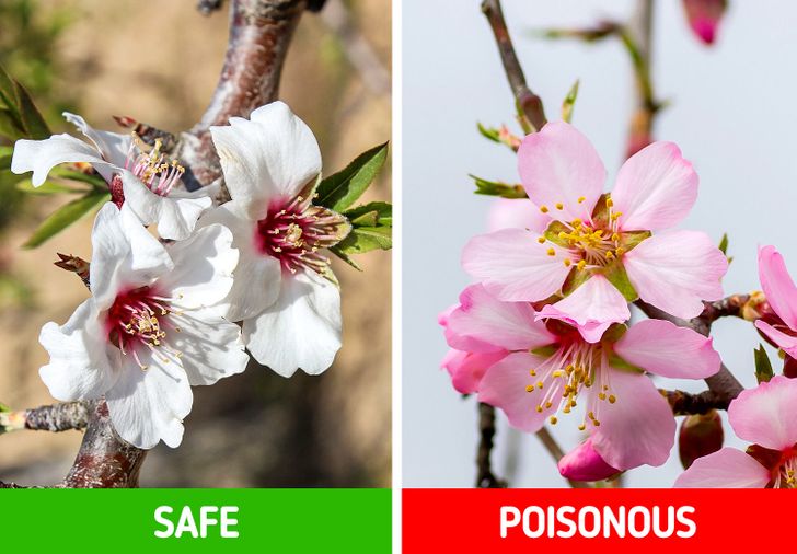 Πώς μπορείτε να τα ξεχωρίσετε: Τα γλυκά αμύγδαλα (που απεικονίζονται αριστερά) συνήθως προέρχονται από δέντρα με λευκά άνθη, ενώ τα πικρά αμύγδαλα (που απεικονίζονται δεξιά) τείνουν να προέρχονται από ροζ άνθη. Ωστόσο, μερικές φορές το χρώμα των ανθών μπορεί να ποικίλει και ένας άλλος τρόπος να τα διακρίνετε είναι από τον καρπό. Τα πικρά αμύγδαλα έχουν λίγο μεγαλύτερο πλάτος και μικρότερο σχήμα σε σύγκριση με τα γλυκά αμύγδαλα.