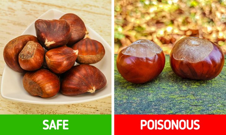 Πώς μπορείτε να τους ξεχωρίσετε: Τα βρώσιμα κάστανα (που απεικονίζονται αριστερά) έχουν πάντα ένα σημείο ή φούντα στο καρύδι. Τα αγριοκάστανα, (απεικονίζονται δεξιά) από την άλλη πλευρά, δεν έχουν θύσανο ή αιχμή στο καρπό, και είναι λεία και στρόγγυλα