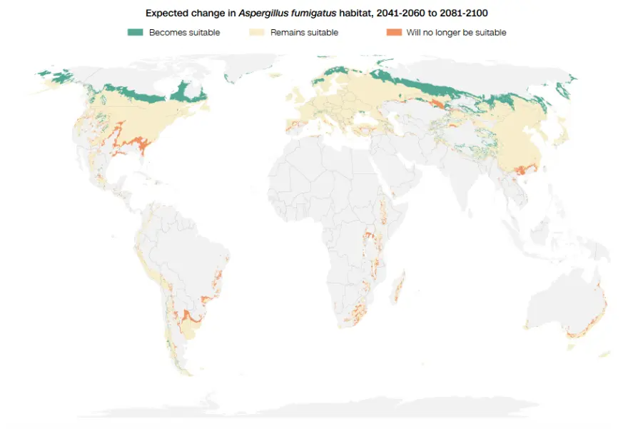 Το Aspergillus fumigatus, που προτιμά πιο εύκρατα κλίματα, αναμένεται να αυξήσει την εξάπλωσή του κατά 77,5% έως το 2100, εκθέτοντας εν δυνάμει 9 εκατομμύρια ανθρώπους μόνο στην Ευρώπη.