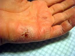 Όταν παρουσιάζεται στα χέρια, μπορεί να έχει επίσης και μικρές φουσκάλες κατά μήκος των πλευρών των δακτύλων ή στις παλάμες. Τα χέρια μπορεί να ξεραθούν και να πονάνε με ανοίγματα και ραγίσματα στις παλάμες ή γύρω απ΄ τα δάκτυλα.