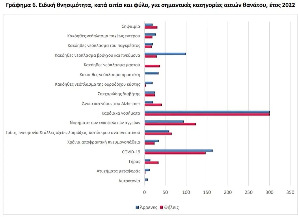 Σύμφωνα με τα στοιχεία του ΕΛΣΤΑΤ, οι κύριες αιτίες θανάτου είναι οι νεοπλασματικές ασθένειες, η COVID-19 και οι παθήσεις του αναπνευστικού.