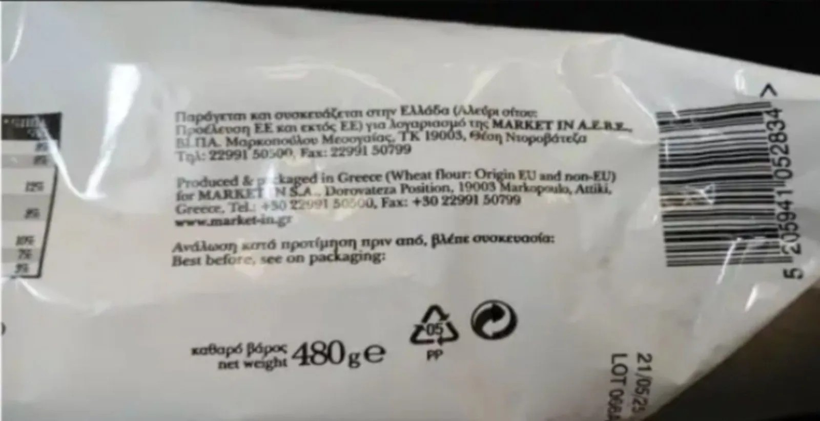 «Τσουρέκι με γέμιση πραλίνα φουντουκιού – μικρές φάρμες του βουνού» με ημερομηνία ανάλωσης κατά προτίμηση πριν από τις 21/05/25 και αριθμό παρτίδας Lot 066A1, συσκευασίας καθαρού βάρους 480g, το οποίο παράγεται και συσκευάζεται στην Ελλάδα για λογαριασμό της ΜΑΡΚΕΤ ΙΝ Α.Ε.Β.Ε. που εδρεύει στην ΒΙ.ΠΑ. Μαρκοπούλου Μεσογαίας.