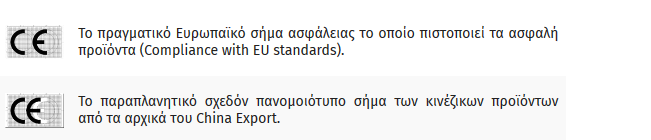 Πολλά κινέζικα, ανασφαλή και χαμηλής ποιότητας προϊόντα όπως, ηλεκτρικές και ηλεκτρονικές συσκευές, εργαλεία, παιδικά παιχνίδια και άλλα, κυκλοφορούν με ψεύτικο ελαφρά παραλλαγμένο το Ευρωπαϊκό σήμα ασφαλείας CE. Το CE πιστοποιεί ότι το συγκεκριμένο προϊόν κατασκευάστηκε με βάση τις αυστηρές προδιαγραφές ασφαλείας της Ευρώπης.