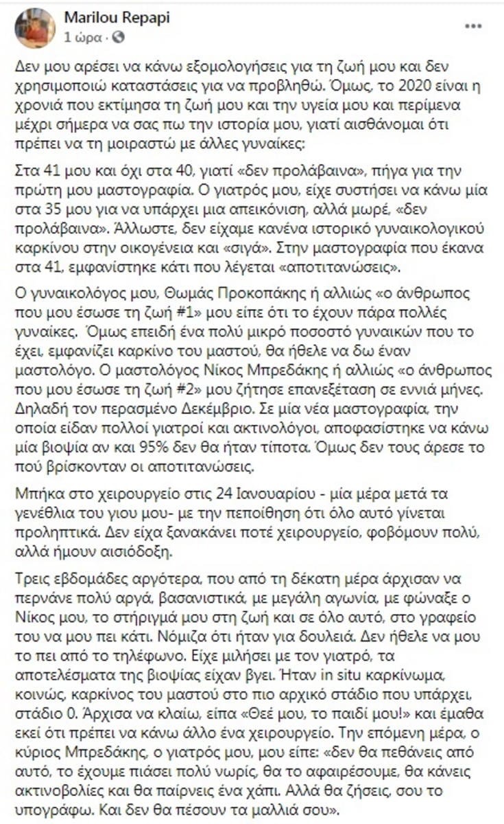 «Δεν μου αρέσει να κάνω εξομολογήσεις για τη ζωή μου και δεν χρησιμοποιώ καταστάσεις για να προβληθώ. Όμως, το 2020 είναι η χρονιά που εκτίμησα τη ζωή μου και την υγεία μου και περίμενα μέχρι σήμερα να σας πω την ιστορία μου, γιατί αισθάνομαι ότι πρέπει να τη μοιραστώ με άλλες γυναίκες: Στα 41 μου και όχι στα 40, γιατί «δεν προλάβαινα», πήγα για την πρώτη μου μαστογραφία. Ο γιατρός μου, είχε συστήσει να κάνω μία στα 35 μου για να υπάρχει μια απεικόνιση, αλλά μωρέ, «δεν προλάβαινα».