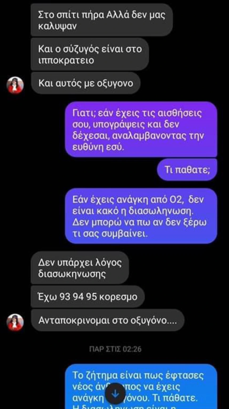 «Θέλουν να με διασωληνώσουν. Με οξυγόνο 93-94. Μπορείτε να με βοηθήσετε;» είπε η 51χρονη.