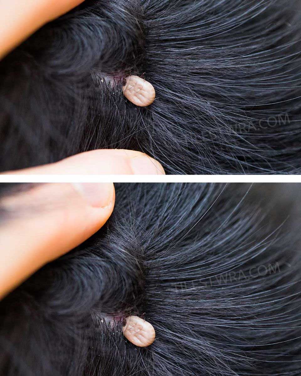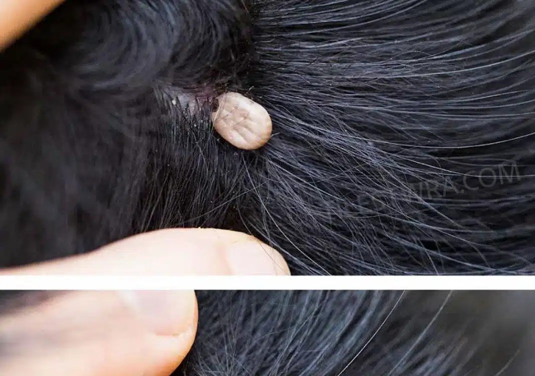 Αυτό που φαίνεται στην εικόνα είναι τσιμπούρι (κρότωνας) και έχει προσκολληθεί στο δέρμα του κεφαλιού. Είναι διογκωμένο, πράγμα που σημαίνει ότι έχει τραφεί με αίμα και πιθανόν να βρίσκεται εκεί για αρκετές ώρες ή και μέρες.