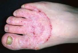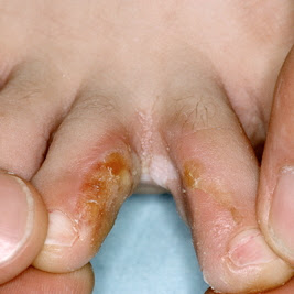 • μαλάκωμα του δέρματος (πληγή) μεταξύ των δακτύλων, στα πέλματα και στις φτέρνες)