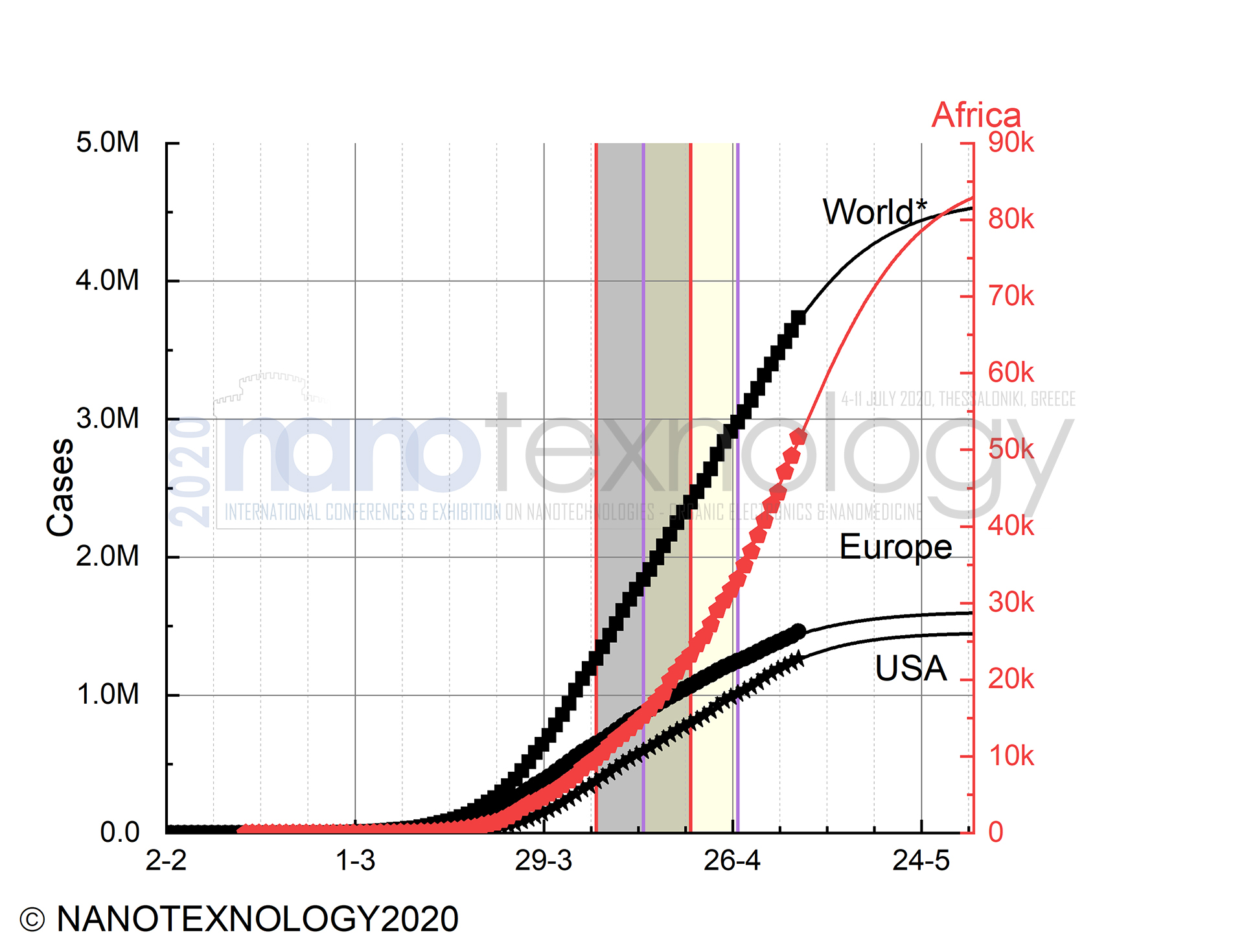 Εξάλλου, σύμφωνα με τα στοιχεία της 7ης Μαΐου, τα επιβεβαιωμένα κρούσματα για την Ευρώπη, τις ΗΠΑ και την Αφρική, αντιστοιχούν στο 39%, 34% και 1,3% των παγκόσμιων περιπτώσεων (με εξαίρεση αυτά της Κίνας). Χρησιμοποιώντας και πάλι την καμπύλη “S” προβλέπεται ότι στις αρχές Ιουνίου, οι επιβεβαιωμένες περιπτώσεις για την Ευρώπη, τις ΗΠΑ και την Αφρική αναμένεται να φτάσουν το 35%, το 32% και το 1,8% των επιβεβαιωμένων περιπτώσεων στον παγκόσμιο πληθυσμό.