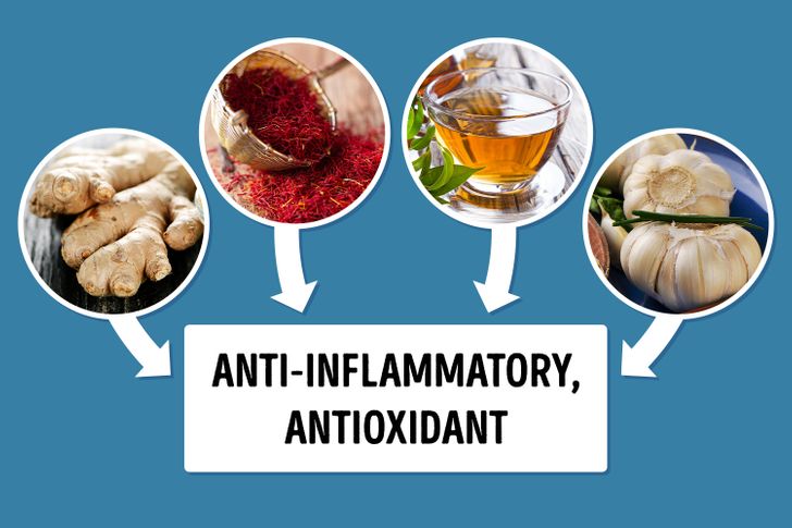 Σαφράν ή κουρκούμη: Δρουν ως αντιφλεγμονώδεις παράγοντες και βοηθούν στη μείωση των συμπτωμάτων της αρθρίτιδας. Μελέτες έχουν δείξει ότι ο κροκίνης, που είναι μία από τις κύριες ενώσεις στο σαφράν, έχει αποδειχθεί ότι έχει αντιφλεγμονώδεις, αντιοξειδωτικές και αντικαρκινικές ιδιότητες και δρα αποτελεσματικά σε άτομα που πάσχουν από πόνο στις αρθρώσεις.