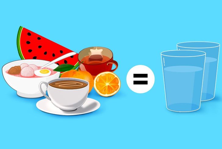 Σε αυτήν την περίπτωση μπορείτε να αντικαταστήσετε ένα μέρος της πρόσληψης νερού με διάφορα φρούτα και λαχανικά που περιέχουν πολύ νερό. Το καρπούζι, τα πορτοκάλια και τα αγγούρια αποτελούνται περισσότερο από 80% από νερό. Και διάφορες σούπες και ποτά, όπως καφές ή τσάι, μπορούν επίσης να αντικαταστήσουν αρκετά ποτήρια νερό.