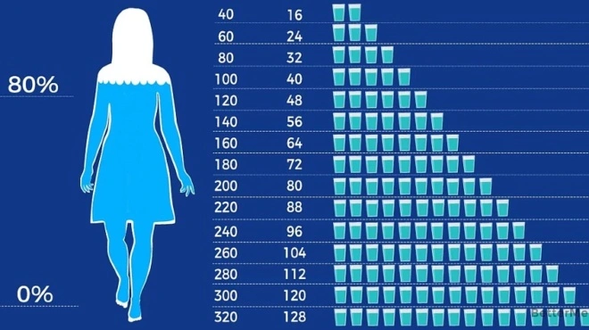 Για να βρείτε την ακριβή ποσότητα νερού που θα πρέπει να καταναλώνετε ανάλογα με το σωματικό βάρος σας, πρέπει να διαιρέσετε το μισό του βάρους σας σε λίβρες δια δέκα. Το αποτέλεσμα αυτού του μαθηματικού τύπου ισούται με τον αριθμό των ουγγιών νερού που χρειάζεται καθημερινά το σώμα σας. Αναλυτικά στον πίνακα της πρώτης εικόνας θα δείτε την μετατροπή σε κιλά και αντίστοιχα σε ποτήρια νερό.