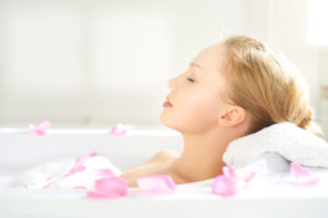 Το να καθίσετε σε γεμάτη μπανιέρα ή να κάνετε μπάνιο με ζεστό (όχι καυτό) νερό για 15 λεπτά, μπορεί να βοηθήσει να μαλακώσουν τα ξηρά κομμάτια του δέρματος και να μειωθεί η φαγούρα και η φλεγμονή. Προσθέτοντας θαλασσινό αλάτι, έλαια για το μπάνιο ή αφρόλουτρο με λιθανθρακόπισσα μπορείτε να ανακουφίσετε και να ενυδατώσετε το σώμα σας.