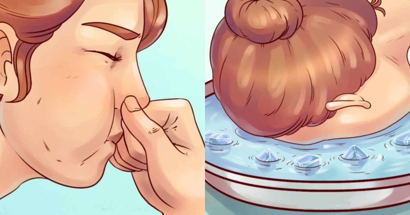 – Αν δε βρείτε το κατάλληλο δοχείο, γεμίστε τις παλάμες σας με νερό και βουτήξτε εκεί το κεφάλι σας. Επίσης, μπορείτε να κάνετε μασάζ με παγάκια στο πρόσωπό σας, δίνοντας έμφαση στην περιοχή των κροτάφων.