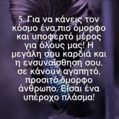 Ιχθύς : Υπάρχουν πέντε λόγοι που γεννήθηκες στο συγκεκριμένο ζώδιο. Αυτούς τους λόγους εμείς του αναλύουμε λίγο πιο κάτω . Όπως για να αγαπάς, για να γιατρεύεις πληγές, για να δείχνεις κατανόηση.